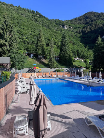 Die große Poolanlage mit beheiztem Pool wir von einem Bademeister beaufsichtigt, sie ist ein wahres Paradies, umgeben von üppiger Natur, die eine entspannende und erholsame Atmosphäre schafft. Sonnenliegen und Sonnenschirme stehen bereit, um den Gästen einen komfortablen Platz zum Entspannen und Sonnenbaden zu bieten. Für die kleinen Gäste gibt es ein Babybecken.